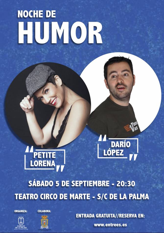 El Teatro Circo de Marte, de Santa Cruz de La Palma, acogerá este sábado, 5 de septiembre, el espectáculo Una noche de humor, de Petite Lorena y Darío López, respaldados por Palante Producciones. La cita,organizada por la Consejería de Cultura del Cabildo de La Palma, que dirige Jovita Monterrey, en colaboración con el Ayuntamiento de la capital palmera, comenzará a las 20:00 horas y tendrá una duración estimada de 90 minutos.