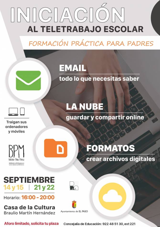 El Ayuntamiento de El Paso, a través de la Concejalía de Educación que coordina Teresa Hernández, ha abierto el plazo de inscripción para participar en el curso ‘Iniciación al Teletrabajo Escolar’, una formación práctica dirigida a las familias que les acercará los conocimientos y herramientas digitales básicas, para hacer frente a los desafíos de la nueva normalidad en la rutina educativa de los hijos-as.