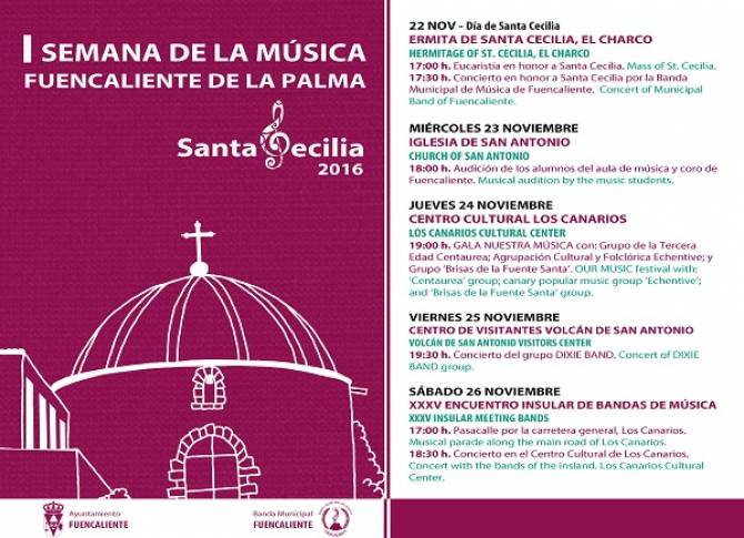 Con la celebración del día de Santa Cecilia, patrona de la música, arranca mañana martes 22 de noviembre la Primera Semana de la Música de Fuencaliente. Una semana donde se podrá disfrutar de distintos grupos y estilos musicales, desde lo más clásico hasta lo más tradicional.