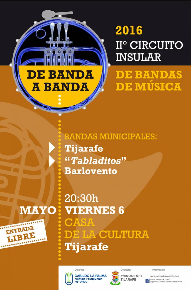 El II Circuito de Bandas Municipales de Música De Banda a Banda, que organiza el Cabildo Insular de La Palma a través de la Consejería de Cultura y Patrimonio Histórico, llega este viernes a Tijarafe en la que será la única cita del circuito a lo largo del presente mes de mayo.