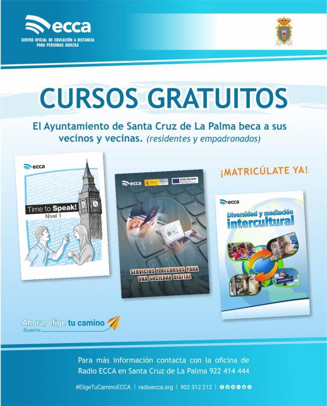 El Ayuntamiento de Santa Cruz de La Palma, a través de la Concejalía de Educación, ofrecerá a través de Radio ECCA cursos gratuitos para los vecinos de la capital. Las acciones formativas a impartir serán ‘Time to speak. Nivel 1’, ‘Servicios y recursos para una sociedad digital’ y ‘Diversidad y mediación intercultural’.