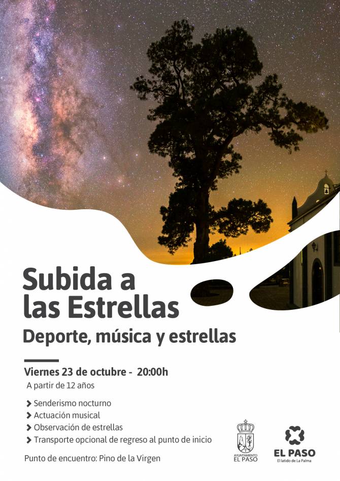 El Ayuntamiento de El Paso participa con este evento en la cita anual de Astrofest 2020, una ruta de senderismo nocturna que invita al público general a realizar el recorrido de la prueba deportiva “Subida a las Estrellas” de Reventón El Paso, aunque en esta ocasión en formato de ocio activo y no competitivo. Una vez alcanzada la cima de La Hilera de Cumbre Nueva, los participantes podrán disfrutar de la intervención musical del grupo Buenavá con un especial ritual musical dedicado a las estrellas y a la relación con nuestros ancestros. Posteriormente se llevará a cabo la observación de cuerpos celestes con telescopio, ofrecida por la empresa especializada Ad Astra La Palma. El evento tendrá lugar el próximo viernes 23 de octubre y comenzará a las 20:00 horas.
