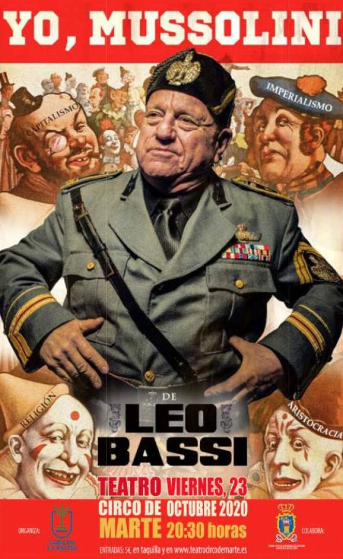El Teatro Circo de Marte acogerá mañana viernes, 23 de octubre, el espectáculo Yo, Mussolini, de Leo Bassi. La cita, organizada por la Consejería de Cultura del Cabildo de La Palma, que dirige Jovita Monterrey, en colaboración con el Ayuntamiento de la capital palmera, comenzará a las 20:30 horas.