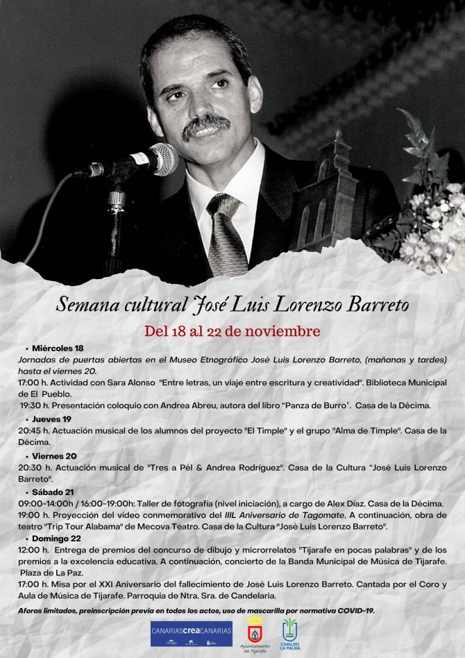 “Pese a que estamos viviendo una situación complicada no queríamos dejar pasar la oportunidad de celebrar la Semana Cultural en memoria de José Luis Lorenzo Barreto,. Para ello, hemos preparado un programa sencillo pero diverso, ofreciendo actos que tocan diferentes disciplinas culturales y que, por supuesto, cumplirán con todas las medidas de seguridad e higiene establecidas. No quiero pasar la oportunidad de invitar a todo el que lo deseé a acudir a los diferentes actos, que se celebrarán del 18 al 22 de noviembre”, señala Diana Lorenzo, concejala de Cultura del Ayuntamiento de Tijarafe.