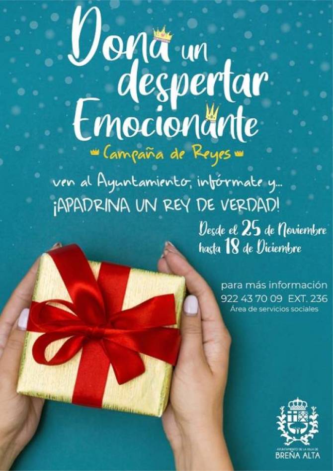 El Ayuntamiento de Breña Alta ha puesto en marcha, desde el 25 de noviembre y hasta el próximo 18 de diciembre, la campaña de Reyes ¡Apadrina un Rey de Verdad!, iniciativa liderada por la Concejalía de Asuntos Sociales del consistorio.