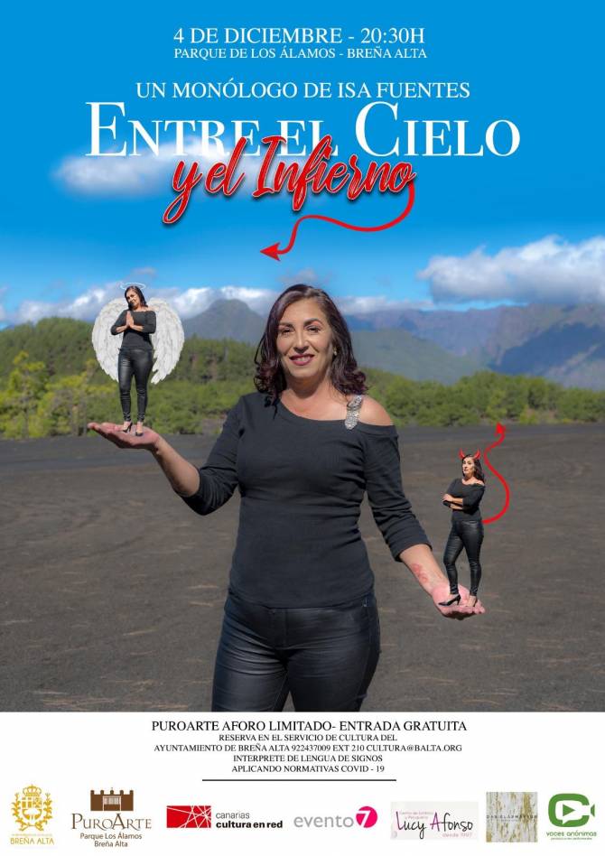 La concejal de Cultura del Ayuntamiento de Breña Alta, Patricia Ayut Martín, explicó que "el espectáculo que ofrece nuestra monologista, Isa Fuentes, es una oportunidad única para dejarnos llevar por la sonrisa y el buen humor, eso sí, en un espacio abierto como el Parque de Los Álamos, y en cumplimiento de los protocolos de seguridad y prevención de la COVID-19". La entrada a la representación 'Entre el Cielo y el Infierno' es libre y con aforo limitado, en cumplimiento del protocolo de seguridad y prevención de la COVID-19, lo que obliga a los asistentes a realizar una reserva previa en el Servicio de Cultura del Ayuntamiento de Breña Alta, en el teléfono 922437009, extensión 210.