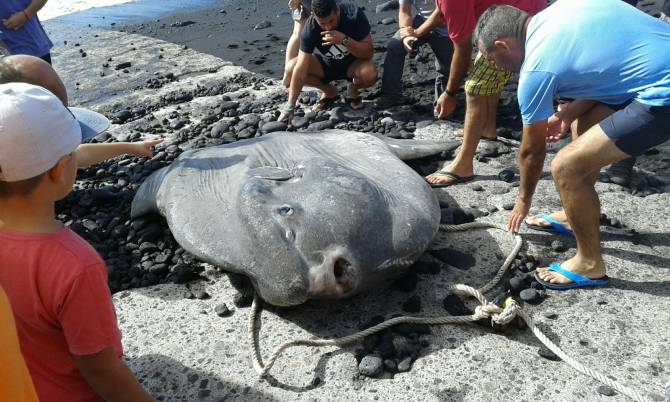 Durante la jornada de hoy los vecinos y bañistas de El Remo, en Los Llanos de Aridane, se vieron sorprendidos por la aparición, flotando en sus aguas, de un ejemplar de Pez Luna (mola mola).