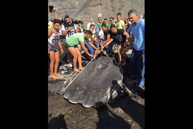 El animal, que mide 2,10 metros, y que se estima que pesa unos 500 kilogramos, fue remolcado, sin vida, hacia la costa, entre espectadores y curiosos.