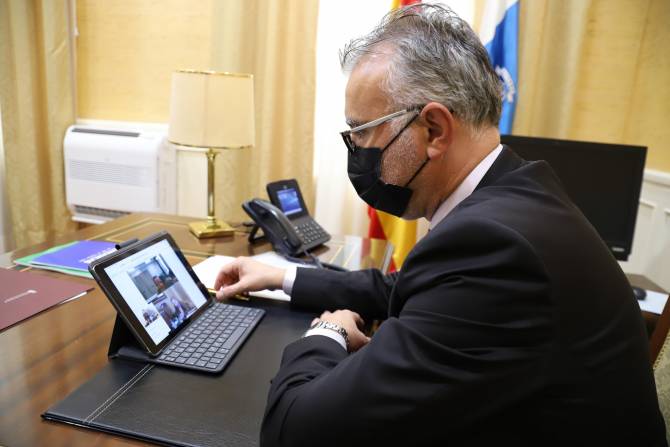 El presidente de Canarias, Ángel Víctor Torres, ha mantenido en la mañana de este jueves 17 de diciembre, desde la sede del Parlamento regional, una reunión por videoconferencia con el Defensor del Pueblo, Francisco Fernández Marugán, quien hace unos días inició una visita a las Islas para interesarse por el fenómeno migratorio con destino a Canarias
