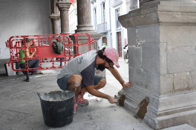 El Ayuntamiento de Santa Cruz de La Palma ha iniciado una intervención de conservación y mantenimiento en las basas de las columnas de la fachada principal de las Casas Consistoriales, cuyo mal estado aconsejaban esta actuación.