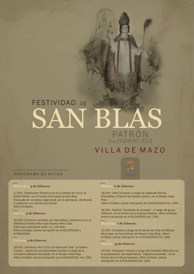 El Ayuntamiento de Villa de Mazo celebra sus fiestas patronales del 3 al 13 de febrero con un variado programa de actividades, que comenzarán el próximo miércoles, a las 17:30 horas, con la celebración de la eucaristía y ofrenda solidaria al patrón, en el Templo Parroquial de San Blas.
