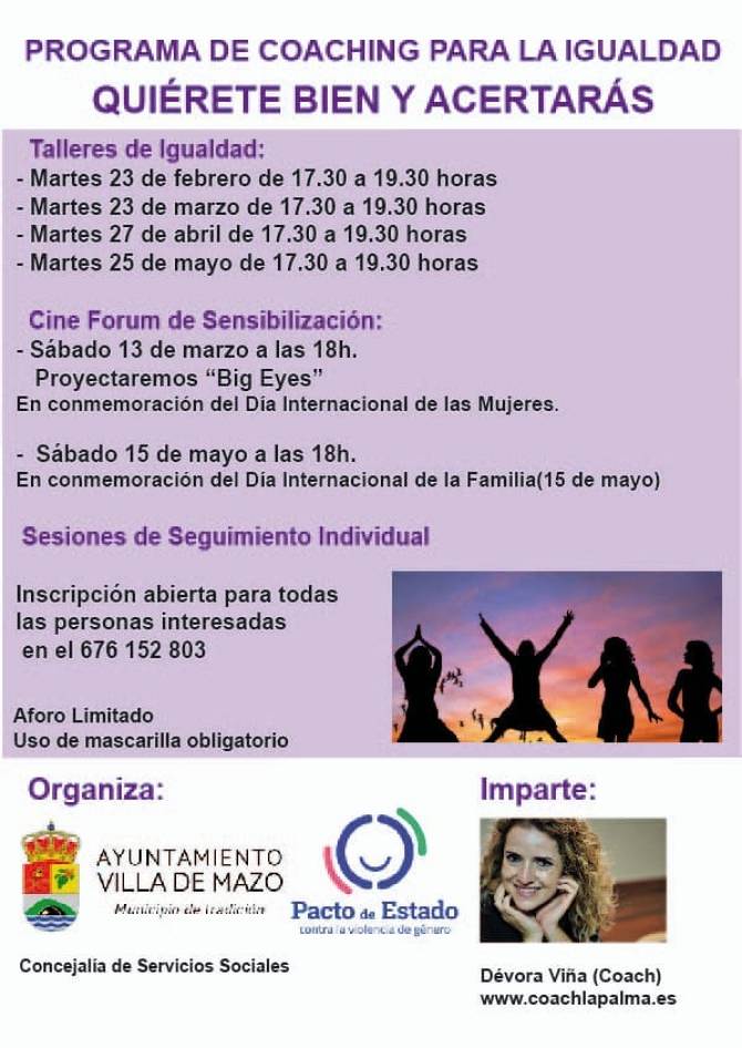 El Ayuntamiento de Villa de Mazo, a través de su Concejalía de Igualdad, pone a disposición de los habitantes del municipio la posibilidad de realizar distintas sesiones de coaching entre los meses de febrero y mayo de este año, que permitan generar una sociedad en la que exista la plena y real igualdad de género.