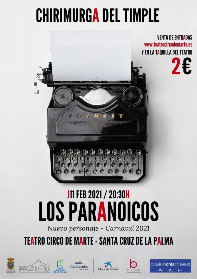 La Concejalía de Cultura del Ayuntamiento de Santa Cruz de La Palma presenta el nuevo espectáculo de humor carnavalero de La Chirimurga del Timple. Este año, los chiflados de la sátira han decidido poner el título de Los Paranoicos a su nuevo personaje. El humor y la crítica social son los ingredientes principales de este grupo.