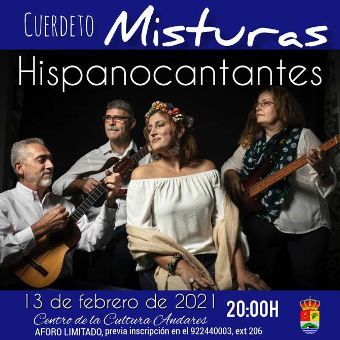 El grupo musical Cuerdeto Misturas, compuesto por los músicos palmeros Mónica Sánchez, Cruz Álvarez, Alberto Pérez y Oswaldo Bethencourt, presentan su espectáculo ‘Hispanocantantes’ en el Centro de la Cultura Andares de Villa de Mazo.