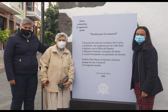 La alcaldesa, Noelia García Leal, y la concejala de fiestas, Mónica González, junto a la homenajeada han descubierto una placa en el portal de su casa, en la Calle del Medio. Y es que si hay en Los Llanos de Aridane una figura que es Carnaval y lo seguirá siendo, es Violeta Pino Pérez, una vecina que nunca falta en el Carnaval de Los Llanos de Aridane.