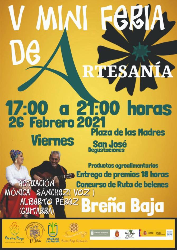 La Asociación de Artesanos "El Telar" de Breña Baja y la Concejalía de Artesanía del Ayuntamiento de Breña Baja organizan la V Mini Feria de Artesanía el viernes 26 de febrero de 17 a 21 hs en la Plaza de Las Madres de San José. Con la colaboración de la Consejería de Artesanía del Cabildo Insular de La Palma y el PFAE (Plan de Formación y Empleo para mayores de 30 años) “Sabor Saucero”.