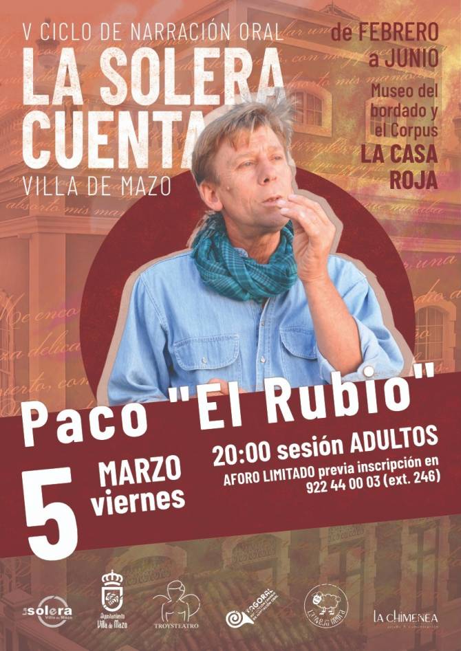 La Concejalía de Cultura del Ayuntamiento de Villa de Mazo continúa con la programación del V Ciclo de Narración Oral La Solera Cuenta, un proyecto impulsado por el consistorio y la Asociación Cultural La Solera. La próxima sesión será el viernes, 5 de marzo, a las 20:00 horas, con un acto dirigido al público adulto a cargo del grancanario Paco del Pino, más conocido como el Rubio, en el Museo Casa Roja.