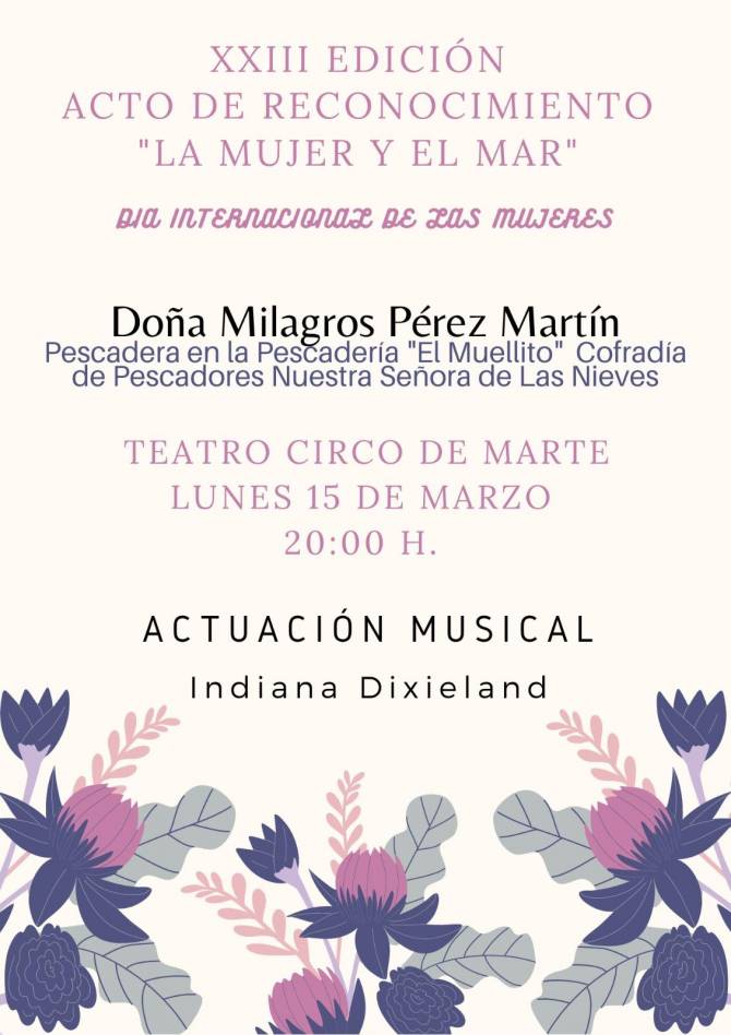 El Ayuntamiento de Santa Cruz de La Palma, a través de la Concejalía de Bienestar Social e Igualdad de oportunidades, reconoce a la pescadera Milagros Pérez Martín como Mujer Destacada del Municipio 2021. El acto de esta 23 edición, dedicada a La Mujer y el Mar., tendrá lugar el próximo lunes, 15 de marzo, a las 20:00 horas, en el Teatro Circo de Marte e incluye la actuación del grupo musical Indiana Dixieland.