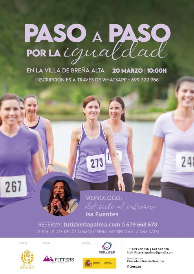 El municipio de Breña Alta celebra este sábado, 20 de marzo, una caminata en conmemoración al Día de la Mujer. Esta actividad, con hora de salida a las 10:00 horas en el Parque de los Álamos y finalización a las 12:00, es impulsada por el consistorio en colaboración con Fitters Tecnificación Deportiva. Una vez finalizada la prueba deportiva, la actriz Isa Fuentes presentará su monólogo del cielo al infierno a las 12:30 horas en el mismo lugar.
