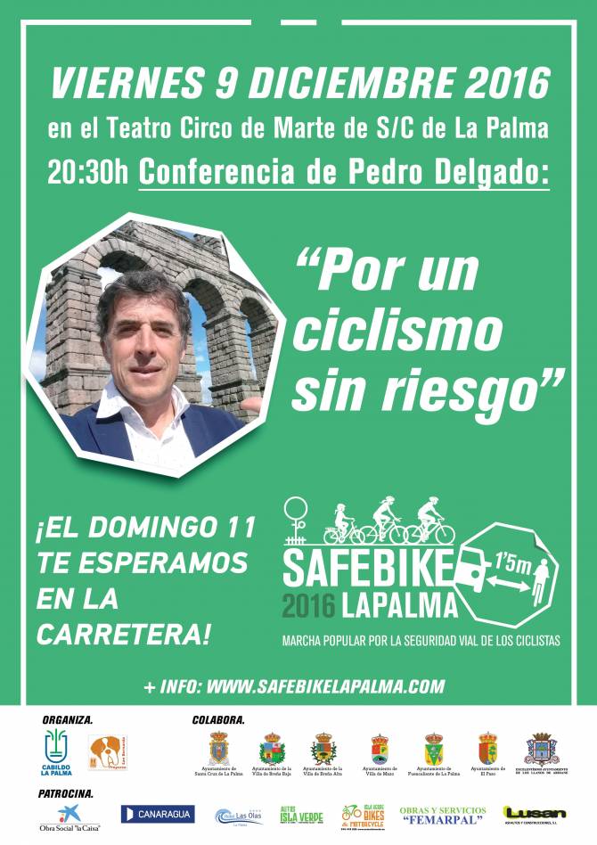 El conocido ciclista y comentarista deportivo Pedro Delgado (ganador del Tour de Francia en 1988 y dos veces ganador de la Vuelta a España) estará en la Isla de La Palma durante la próxima semana con motivo del apadrinamiento que realizará a la marcha cicloturista de concienciación Safe Bike La Palma que organiza la Consejería de Infraestructuras del Cabildo y que se celebra el próximo domingo, 11 de diciembre, Dos días antes, el viernes 9, a partir de las 20:30 horas, ‘Perico’ Delgado ofrecerá una charla abierta al público, en el Teatro Circo de Marte, bajo el título de Ciclismo sin Riesgo.