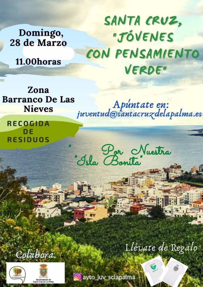 El Ayuntamiento de Santa Cruz de La Palma, a través de la Concejalía de Juventud, coorganiza una nueva limpieza en la zona del Barranco de Las Nieves, que tendrá lugar el domingo 28 de marzo, a partir de las 11:00 horas. Se trata de una iniciativa impulsada por la juventud del municipio y que se enmarca dentro del proyecto de voluntariado ambiental Santa Cruz, Jóvenes con Pensamiento Verde, con el que se quiere promover la responsabilidad y concienciación ciudadana.