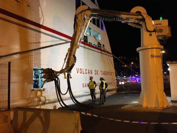 Fue en la noche de ayer viernes cuando se realizó el primer suministro oficial, en este caso al buque de Naviera Armas, Volcán de Taburiente, el único que cuenta con motores adaptados para conectarse a la red, lo que le permite desconectar sus unidades auxiliares manteniendo todos los servicios esenciales a bordo. Fue la ocasión propicia para comprobar que el procedimiento cumplía con las condiciones de seguridad y prestaciones correspondientes.