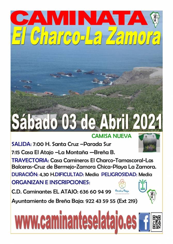 El C. D. de Caminantes "El Atajo" y la Concejalía de Deportes del Ayuntamiento de Breña Baja organizan, dentro del Programa de Senderismo de Breña Baja, la caminata nº 692: "El Charco - La Zamora" del municipio de Fuencaliente, prevista para el l sábado 3 de abril.