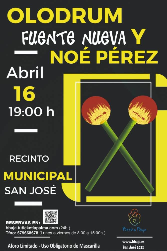 Los grupos de percusión “Olodrum” de Breña Baja y “Fuente Nueva” de San Andrés y Sauces” actuarán el viernes 16 de abril a las 19.00 hs, en el Recinto Municipal de San José; además tendrá lugar la interpretación musical de Noé Pérez Regalado al acordeón. Organiza el Ayuntamiento de Breña Baja y dentro de los actos previstos por el Día de San José 2021.