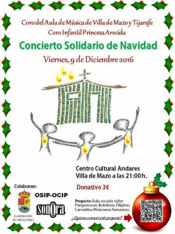 El Ayuntamiento de Villa de Mazo organiza, junto a Sonora Canarias (Socan) y la Orquesta de Cámara Isla de La Palma (OSIP – OCIP), un concierto solidario de Navidad a favor de la ONG Carmelitas Misioneras Teresianas, en beneficio de su proyecto de construcción y adecuación de un Aula escuela taller en el municipio de Pangantucan, en la isla filipina de Mindanao.