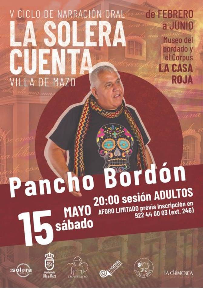 El Ayuntamiento de Villa de Mazo, a través de la Concejalía de Cultura, continuará con la programación del V ciclo de narración 'La Solera Cuenta' el sábado, 15 de mayo, a las 20:00 horas, con la celebración de una sesión para público adulto a cargo del narrador Pancho Bordón, en el Museo Casa Roja.