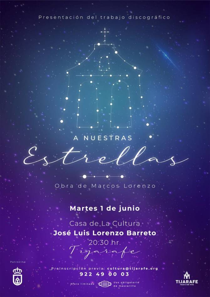Tras culminar la grabación de la composición musical, grabación dirigida también por Marcos Lorenzo y en la que han confluido excepcionales músicos y cantantes entre los que no ha faltado representación tijarafera de primer nivel, la Casa de la Cultura José Luis Lorenzo Barreto acogerá el 1 de junio, a las 20:30 horas, la presentación de este emotivo proyecto, homenaje a todas las personas que se han convertido en estrellas. Para este acto también se ha contado con talento palmero, ya que el cartel ha sido realizado por el diseñador Mario Martín Remedios, el trabajo técnico ha corrido a cargo de Basilio Gutiérrez y Raúl Acosta será el encargado de dirigir la presentación.