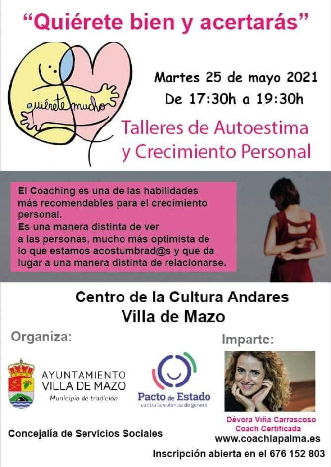 El Ayuntamiento de Villa de Mazo, a través de la Concejalía de Igualdad, celebrará el próximo martes, 25 de mayo el Taller de Autoestima y Crecimiento Personal, enmarcado en el proyecto Quiérete bien y acertarás. La actividad tendrá lugar de 17:30 a 19:30 horas, en el Centro de la Cultura Andares.