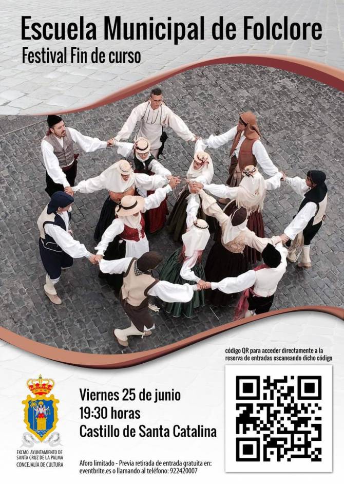El Ayuntamiento de Santa Cruz de La Palma organiza el festival folclórico con el que la Escuela Municipal de Folclore clausura el curso 2020/21. La actuación tendrá lugar el viernes, 25 de junio, a las 19:30 horas en el Castillo de Santa Catalina.