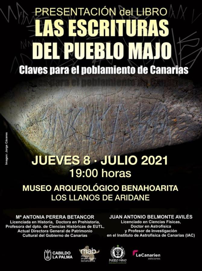 El próximo jueves, 8 de julio de 2021, a las 19,00 horas, tendrá lugar en el Museo Arqueológico Benahoarita la presentación del libro 'Las escrituras del Pueblo Maho: claves para el poblamiento de Canarias', cuyos autores son María Antonia Perera Betancort, doctora en Prehistoria y actual Directora General de Patrimonio Cultural de Canarias, y Juan Antonio Belmonte Avilés, doctor en Astrofísica y profesor de Investigación en el Instituto de Astrofísica de Canarias.