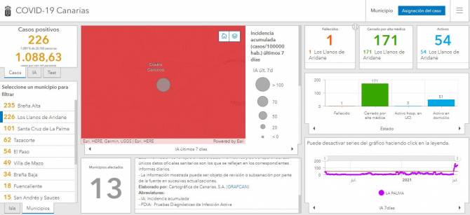 Volviendo a los casos de La Palma, los datos por municipios son los siguientes: Los Llanos de Aridane cuenta con 54 casos activos, El Paso cuenta con 22 casos, Santa Cruz de La Palma con 20, Breña Alta con 15 y Tazacorte con 13 casos activos. Por otro lado, Fuencaliente cuenta con 8 casos activos, Villa de Mazo y Breña Baja tienen 7 casos activos en cada municipio, Tijarafe 5, Puntallana 3, Garafía 2 y San Andrés y Sauces cuenta con 1 caso activo actualmente.