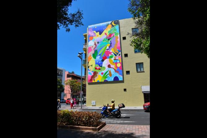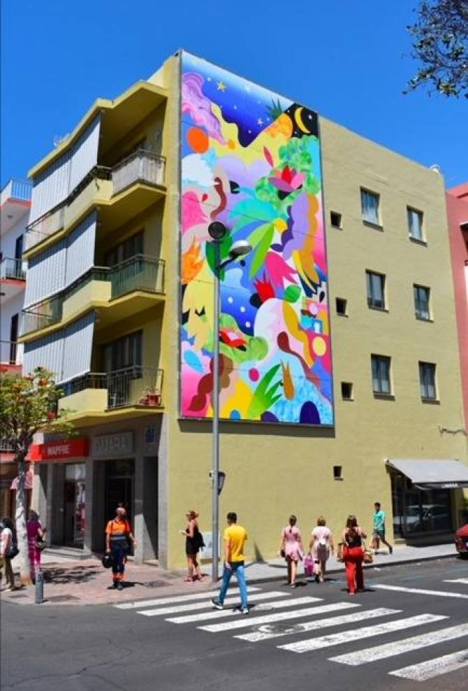 Con esta pieza para el CEMFAC, “Vista de la isla desde el mar, la tierra y el cielo”, Mina Hamada revisita el paisaje de la isla de La Palma, desde un punto de vista que podríamos denominar de cándido o ingenuo. Desde la sinuosa orografía en unos casos, la carretera de la cumbre con sus dos túneles, a la zona volcánica del sur de la Isla, a los asentamientos urbanos de costa, La Bombilla y El Remo, pasando por la voluptuosidad y frondosidad de los laureles de indias de zonas peatonales de Los Llanos de Aridane, así como sus visitas a la recova o plaza del mercado, en la que descubre el rico colorido de las frutas de la isla, son algunas de las referencias que plasma en este cuadro de más de 70 m² de superficie, instalado en la Avenida Dr. Fleming.