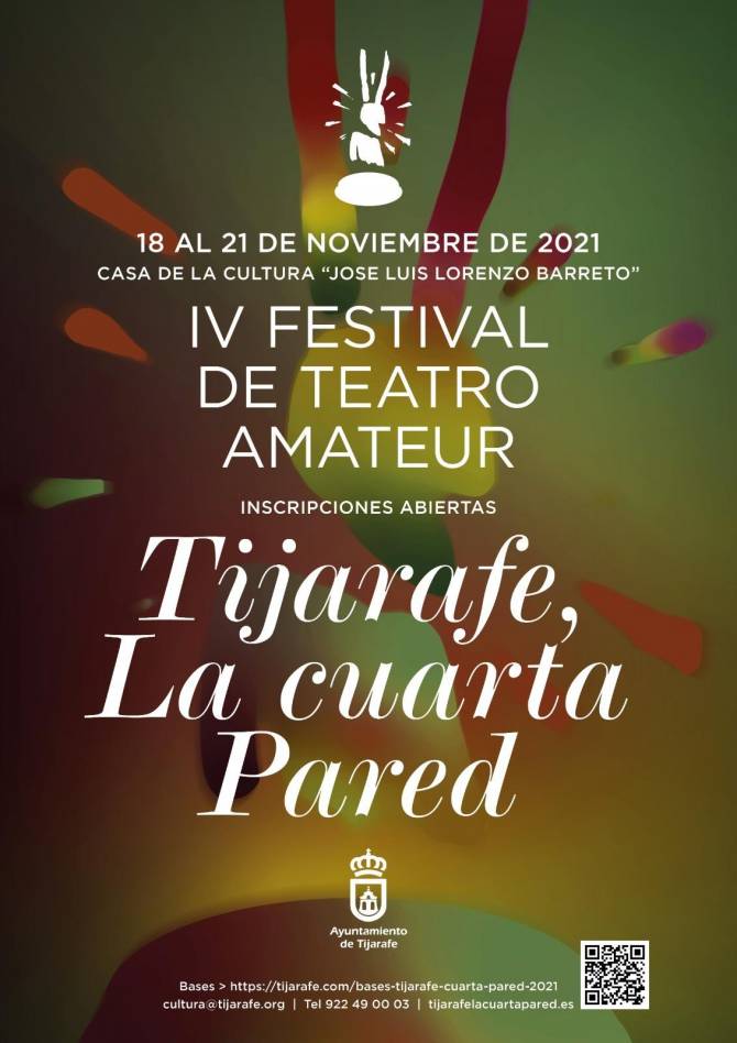 La cita con el teatro amateur regresa al municipio de Tijarafe en el mes de noviembre con la celebración de la cuarta edición del Festival “Tijarafe, La Cuarta Pared”. Concretamente, la semana del 18 al 21, la Casa de la Cultura “José Luis Lorenzo Barreto” acogerá la puesta en escena de las obras de los grupos participantes, que podrán presentar sus trabajos desde este viernes, 17 de septiembre.