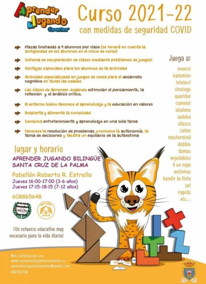 Esta actividad se impartirá los jueves, desde este mes y hasta mayo de 2022, con grupos reducidos de 9 personas y organizados por edad (de 3 a 6 y de 7 a 12 años). Las personas interesadas pueden solicitar más información en el teléfono 646 262 186, la dirección de correo electrónico lapalma@aprenderjugandocanarias.es o directamente en la web https://aprenderjugandocanarias.es/