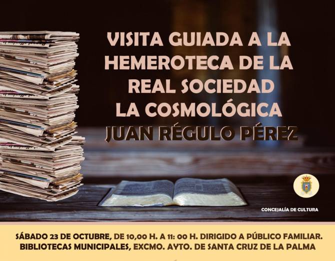 El recorrido guiado en la hemeroteca Juan Régulo Pérez será este sábado (23 de octubre), a las 10:00 horas, y contará con las explicaciones detalladas de la mano de la técnico de Fondo Antiguo y Hemerográfico de esta institución, María del Carmen Aguilar Janeiro. Las personas interesadas en participar en esta propuesta cultural, deben inscribirse enviando sus datos por correo electrónico a culturapilar@santacruzdelapalma.es o llamando al teléfono 922 420 007.