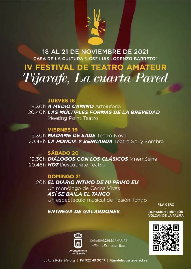 Beatriz Gómez, directora del festival, indica "llevamos arrastrando más de un año y medio una pandemia y ahora el volcán nos deja completamente desolados, pero si hay algo que me hace sentir orgullosa, es seguir contando con el apoyo del Ayuntamiento de Tijarafe, porque ahora, más que nunca, es cuando debemos acercar la cultura al mundo. Tijarafe, la cuarta pared, recupera el formato inicial para ilusionar, distraer y dinaminazar el municipio y, por ende, toda la isla de La Palma, adoptando este año un carácter solidario. En el entorno cultural no somos insensibles a esta problemática y queremos tener un gesto con los damnificados por el volcán".