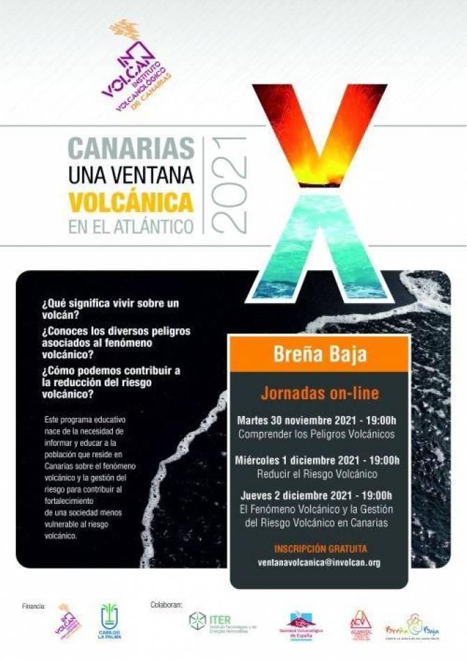 El Ayuntamiento de Breña Baja y el Instituto Volcanológico de Canarias (INVOLCAN) convocan las X Jornadas “Canarias, una ventana volcánica en el Atlántico” del 30 de noviembre al 2 de diciembre de 19 a 21 hs, en formato digital. Matricula gratuita a través del correo: ventanavolcanica@involcan.org.