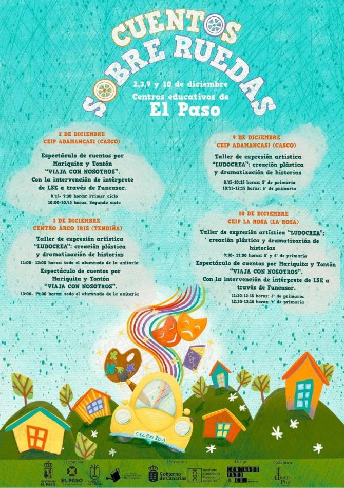 El proyecto de fomento de la lectura y la narración ‘Cuentos sobre ruedas’ inicia su recorrido por los colegios del municipio este próximo mes de diciembre. Tendrán lugar cuatro sesiones en esta nueva edición que corresponde al Ciclo de Invierno y que organiza la compañía de teatro Contando Ando & Co. con el patrocinio del Ayuntamiento de El Paso, el Cabildo de La Palma y el Instituto Canario de Desarrollo Cultural, ICDC y la colaboración de Diego Pun Ediciones.