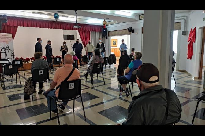 El alcalde del municipio, Juan José Cabrera, junto al primer teniente de alcalde, Juan José Neris, y una representación de la Corporación municipal, han visitado este martes, 13 de diciembre, el Centro de Día de Mayores, acompañado por la directora, Sarely Rodríguez, con el objetivo de conocer de primera mano el resultado de las acciones realizadas y las impresiones de las personas usuarias.