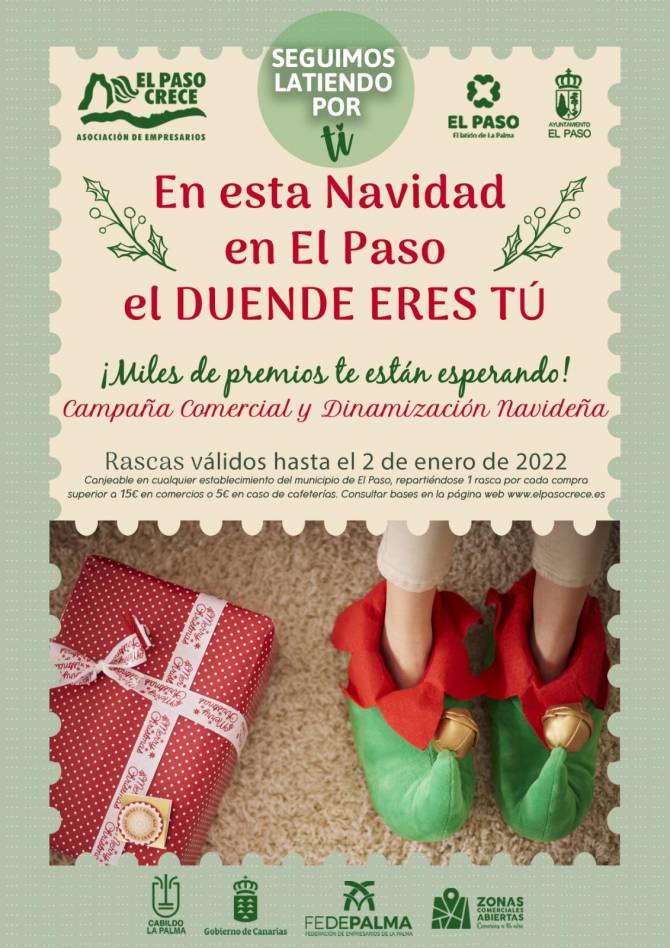 “Ya lo habíamos adelantado y hoy podemos informarles del inicio de nuestra emblemática campaña de dinamización y promoción del tejido comercial que este año renovamos con el lema ‘En esta Navidad, el Duende eres tú’. A partir de este jueves y hasta el próximo 2 de enero tus compras en el municipio pasense llegan repletas de premios”, sostienen desde el Ayuntamiento de El Paso y la Asociación de Empresarios El Paso Crece. ‘Rasca, gana y sonríe a la suerte’, para que puedas ahorrar y además beneficiarte de todas las facilidades de una ciudad céntrica, acogedora, repleta de posibilidades donde elegir y con todos los productos y servicios que buscas a tu alcance sin eternas esperas ni agobios. En estas fechas, ahora más que nunca siente local, consume aquí y haz posible que “Sigamos latiendo por ti”.