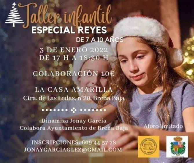 El lunes 3 de enero a las 17.00 hs la Asociación Agrocultural “El Aljibe” organiza un Taller Infantil Especial por Reyes en la Casa Amarilla de Las Ledas. Se cuenta con la colaboración de la Concejalía de Cultura del Ayuntamiento de Breña Baja.