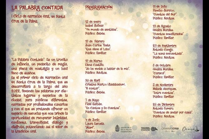 La Concejalía de Cultura del Ayuntamiento de Santa Cruz de La Palma organiza el Primer Ciclo de Narración Oral del municipio, una iniciativa que se desarrollará a lo largo de 2022 y con el que se pretende acercar el arte de la tradicional oral a los diferentes núcleos de la ciudad.