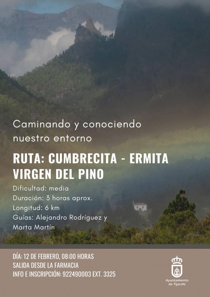 Este sábado, 12 de febrero, se retoman las rutas temáticas guiadas “Caminando y conociendo nuestro entorno”, tras su paralización por la COVID-19. Senderistas del municipio caminarán por los seis kilómetros que separan la Cumbrecita de la Ermita de la Virgen del Pino. El punto de encuentro se establecerá en la Farmacia de Tijarafe a las 08:00 horas y la ruta estará guiada por Alejandro Rodríguez y Marta Martín.