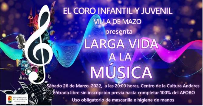 El Ayuntamiento de Villa de Mazo organiza el festival del coro infantil y juvenil del municipio bajo el título de 'Larga vida a la música'. El evento tendrá lugar el sábado, 26 de marzo, a las 20:00 horas, en el Centro Cultural de Andares.
