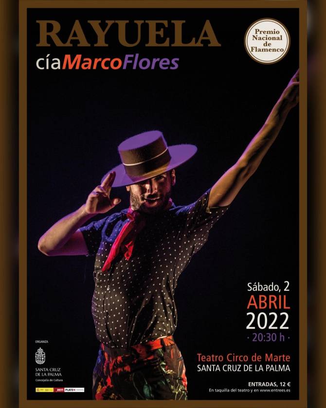 El Teatro Circo de Marte de Santa Cruz de La Palma acoge este sábado, 2 de abril, a las 20:30 horas, el último espectáculo del bailaor y coreógrafo Marco Flores, 'Rayuela'. El artista, natural de Arcos de la Frontera (Cádiz), estará acompañado por las guitarras y voz de David y Alfredo Lagos.