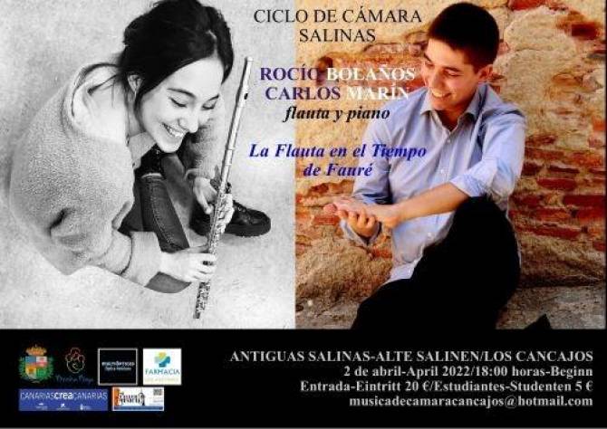 El sábado 2 de abril a las 18 hs tendrás lugar el cuarto concierto de la octava edición del Ciclo de Cámara Salinas, con la actuación de Rocío Bolaños (flauta) y Carlos Marín (piano) bajo el título de “La flauta en el tiempo de Fauré” en las Antiguas Salinas de Los Cancajos.